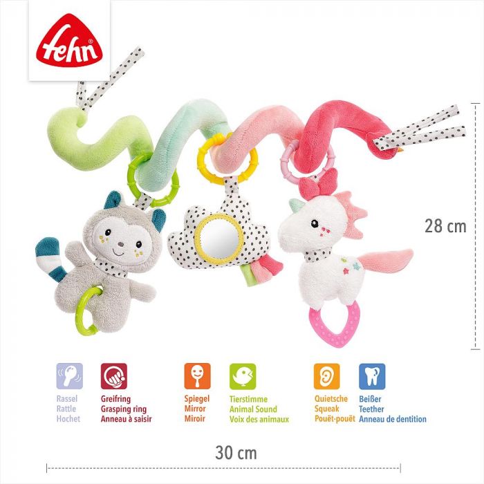 Introducing our Plush Spiral with Adorable Animal Pendants – A Sensory Adventure for Babies and Toddlers 0+ Watch your child’s sense of touch and fine motor skills flourish, whether you’re at home or on the go, with our delightful plush spiral toy. This enchanting playtime companion features a captivating combination of textures, colors, and features that are sure to engage and entertain. Playing is a guaranteed delight with our charming characters, Unicorn Aiko and the endearing Cat Yuki. They become your child’s constant companions, accompanying them on their adventures, be it indoors or while out and about. These small plush toys beckon exploration, encouraging little ones to watch, play, and grasp them. This playful interaction fosters essential hand-eye coordination and self-awareness as your child engages with the spiral’s enchanting array of materials. Designed as the first motoric toy for both boys and girls, our spiral offers an array of engaging features. The gentle rattle, soft squeak, and delightful animal sounds are sure to bring joy to your baby’s eyes. The charming 3-D figures add a tactile dimension to the fun. Practicality meets playfulness, as this spiral chain can be easily attached to a crib, playpen, pram, or infant carrier, thanks to its movable pendants. Plus, it’s machine washable at 30°C, ensuring it stays fresh and clean for endless playtime adventures. This Plush Spiral with Animal Pendants is not just a toy; it’s a sensory journey and a cherished companion for your little one’s early developmental stages.