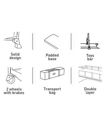 It includes: double layer, toys bar, toys bag, padded base, zipper entrance and transport bag