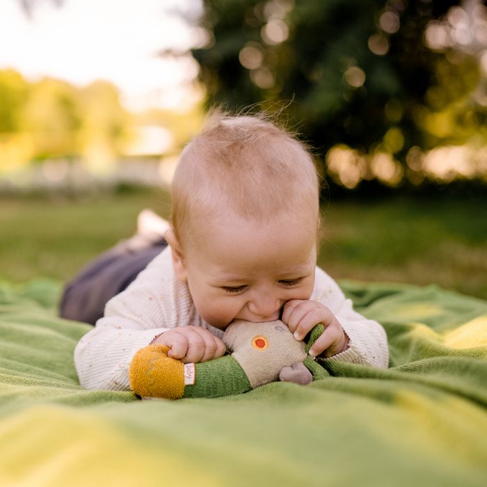Cuddly grasping toy for rattling, squeaking, touching, playing – a devoted companion for babies and toddlers.   This small toy with bright colors, textures and lovely details is the perfect size to take everywhere with you!  An ideal present for any occasion and available in 6 different animal types to choose from.