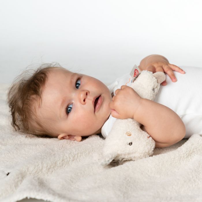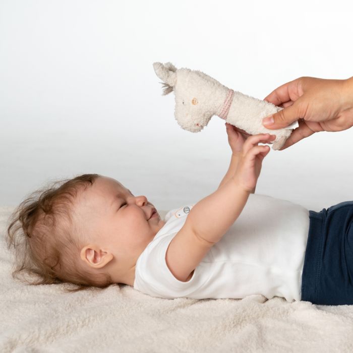 Cuddly grasping toy for rattling, squeaking, touching, playing – a devoted companion for babies and toddlers.   This small toy with bright colors, textures and lovely details is the perfect size to take everywhere with you!  An ideal present for any occasion and available in 6 different animal types to choose from.