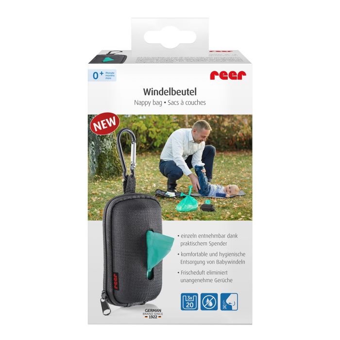 Hygienic and Convenient Diaper Disposal Solution When you’re out and about with your baby, changing diapers on the go can be a challenge. Often, you may not have immediate access to a proper disposal method, leading to unpleasant odors and contamination of other baby items in your bag. But with reer Nappy Sacks, you can conveniently and hygienically dispose of dirty diapers with no foul odors. These sacks are designed to be practical and reliable in any situation. Hygienic Disposal: Made from tear-resistant material and equipped with convenient carrying handles, reer Nappy Sacks ensure the hygienic disposal of used baby diapers. The liquid-tight film prevents leakage, protecting fresh diapers and other baby clothes in your bag. Plus, the subtle lemon fragrance eliminates unpleasant odors. Easy Single Removal: The nappy sacks come in a handy dispenser with a wide opening for easy access. With the pre-punched tear line, you can quickly and effortlessly separate individual bags from the roll. When you finish a roll of 20 sacks, simply refill the dispenser with one of the two spare rolls provided. Perfect for On-the-Go: The dispenser is designed with a sturdy metal snap hook called Clip&Go, allowing you to easily attach it to your diaper bag. This way, the dispenser is always within reach whenever you need it, without the hassle of rummaging through your bag. Whether you’re shopping, visiting the playground, or on a day trip, reer Nappy Sacks provide a convenient solution for diaper disposal on the go.