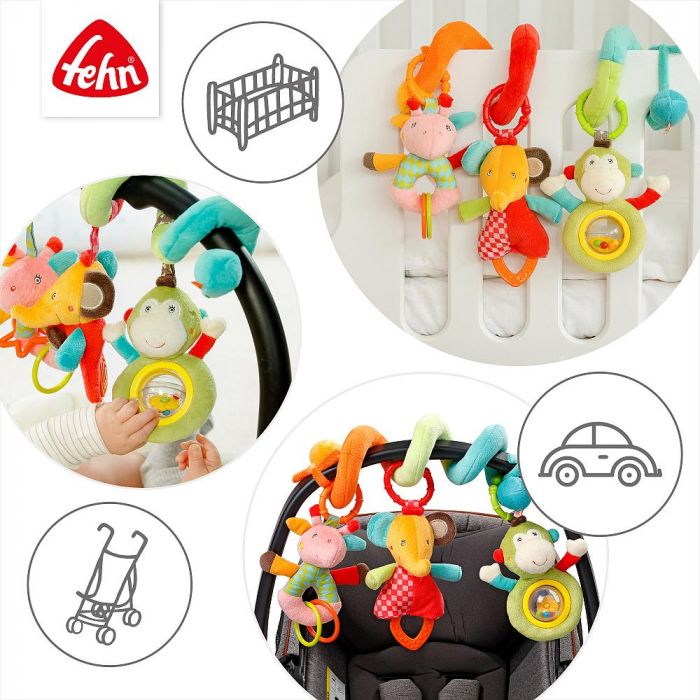 Embark on a Journey of Discovery with the Activity Spiral Safari Introducing the Activity Spiral Safari, a captivating and versatile companion for your baby’s early years. This remarkable plush spiral with adorable animal pendants is designed to engage, entertain, and stimulate your baby’s senses and motor skills. Whether you’re at home or on the move, this activity spiral is tailor-made for infants and toddlers aged 0 and beyond. Unending Playtime Excitement: With the enchanting Safari spiral, your baby will always have their cherished animal friends by their side, promising hours of entertainment and companionship. Whether it’s a quiet afternoon at home or a thrilling adventure outdoors, this spiral ensures playtime fun is guaranteed. Early Educational Enchantment: The Safari spiral offers more than just amusement; it’s the perfect introductory educational toy for both boys and girls. The delightful rattling sounds emitted by the spiral are designed to bring pure joy to your baby’s eyes, nurturing their curiosity and early learning. Development in Every Detail: Our small plush toys aren’t just irresistibly charming; they also invite your little one to explore and interact. Watch, play, and grasp – these activities subtly enhance early hand-eye coordination and self-awareness. The spiral’s unique blend of materials and features serves as a valuable tool in your baby’s developmental journey. Convenience at Its Best: Attaching the spiral to your crib, playpen, pram, or infant carrier is a breeze, thanks to the easily movable pendants. As parents, we understand the importance of cleanliness, so we’ve designed this spiral to be machine washable at 30°C, ensuring it stays as fresh as new, no matter how many adventures it embarks on. Make Each Moment an Adventure: The Activity Spiral Safari is more than just a toy; it’s a gateway to exploration, learning, and joy. Elevate your baby’s early development and playtime experience with a companion that sparks their imagination and supports their growth. Discover the magic of the Safari spiral and create lasting memories with your little one