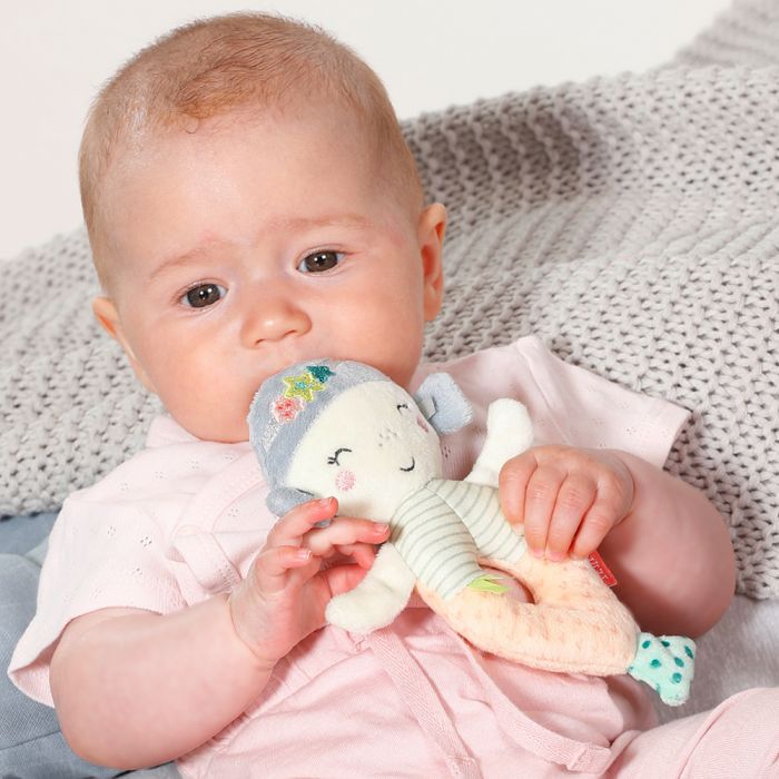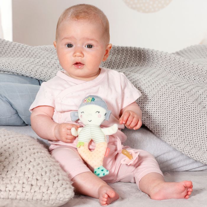 The little ring grabber mermaid playfully stimulates baby´s sense of hearing, touch and grasping. With the great corduroy material and exciting sound of the integrated rattle, it never gets boring. Babies love the cute fabric mermaid to grasp, touch, discover & cuddle! The little dinosaur can be taken everywhere and can accompany your baby while playing and dreaming in the cot, in the baby car seat or in the stroller.